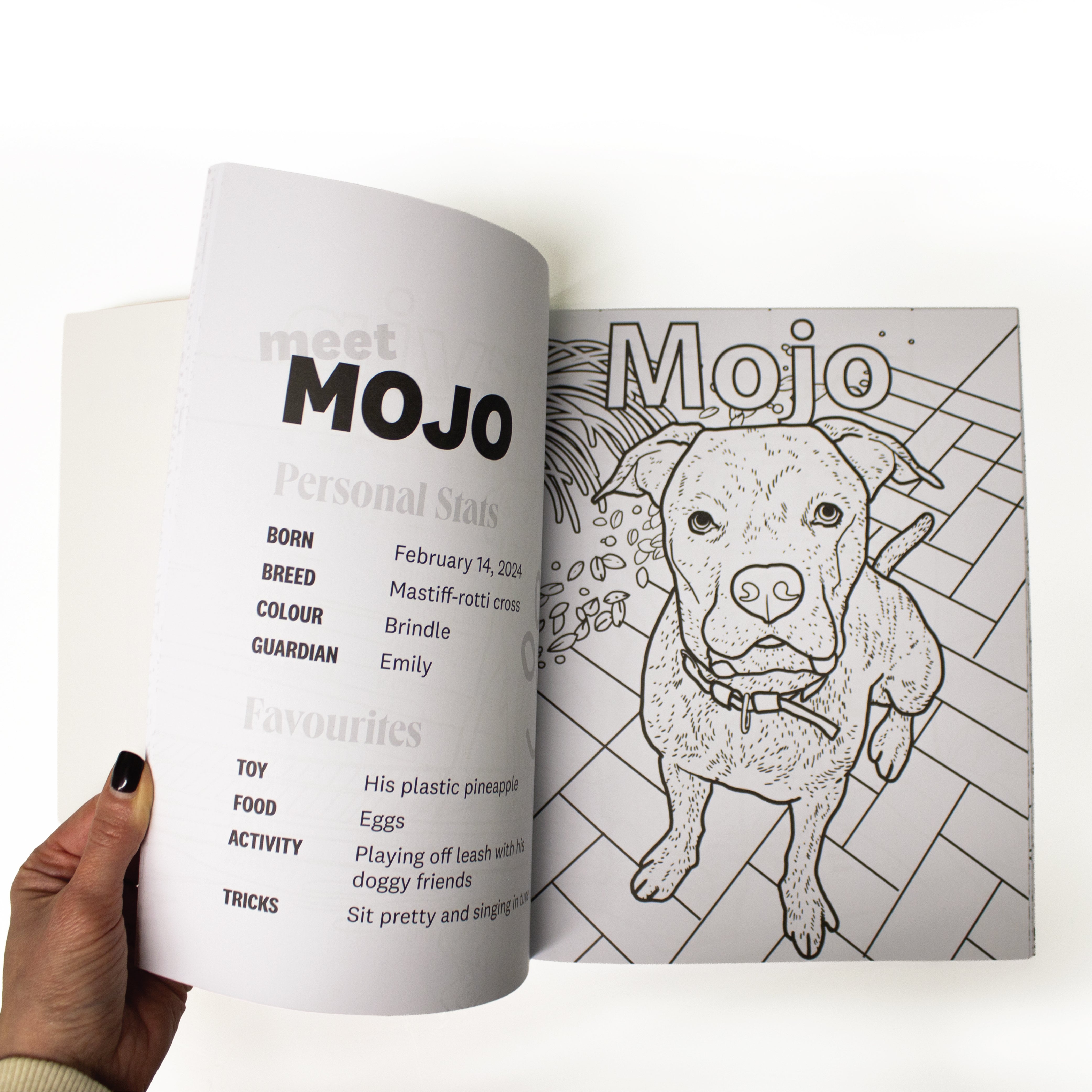 - Each page features a hand drawn therapy pet with their personal stats.